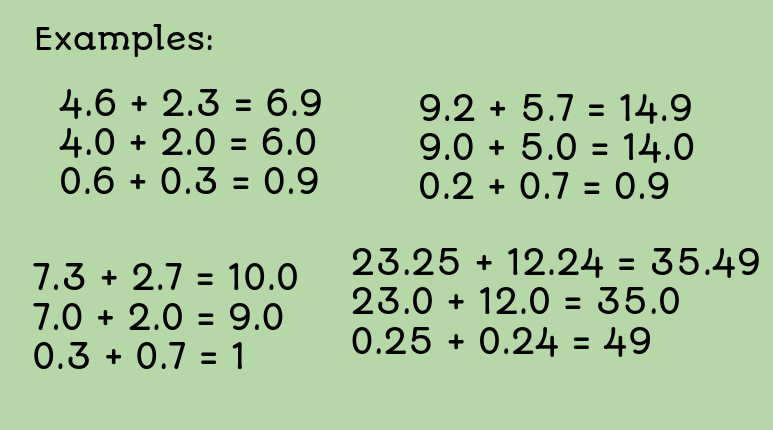 My focus this week was to show that I understand how to do my learning goal. To show that I understand my learning goal for maths I made examples on slides and how I got the answer for each and everyone of them. In total of questions I made is 24 questions I did try my best to answer them all correctly and make how I did it also correct. I did many examples to kinda make it sound like I'm showing people how to do it. To do it I add the whole numbers together say if I had 4.5 + 3.2 = __ I would add 4.0 + 3.0 = 7.0 then I would add the other numbers so 0.5 + 0.2 = 0.7 then I would add 7.0 + 0.7 = 7.7.